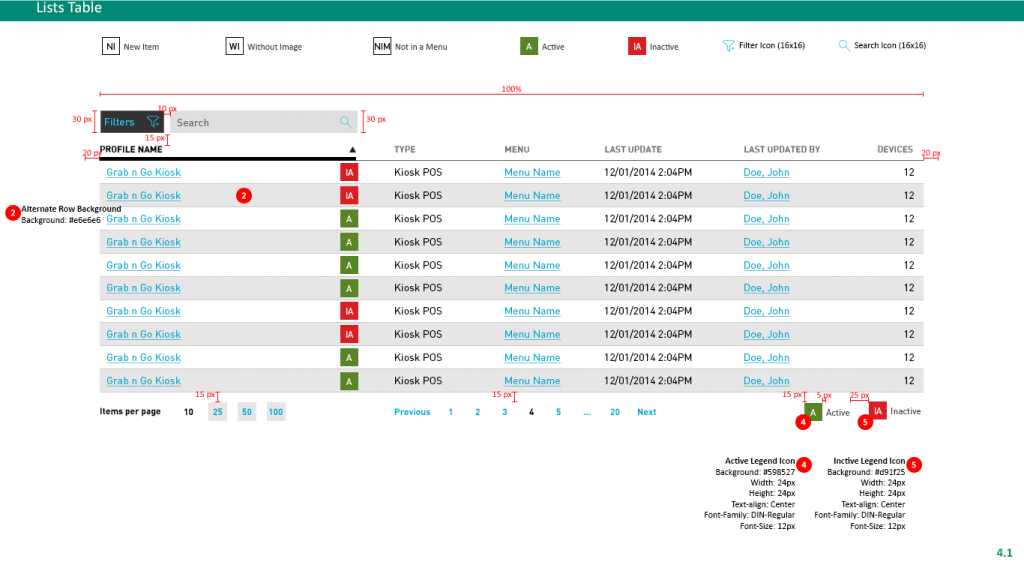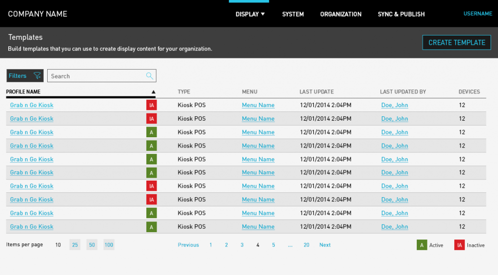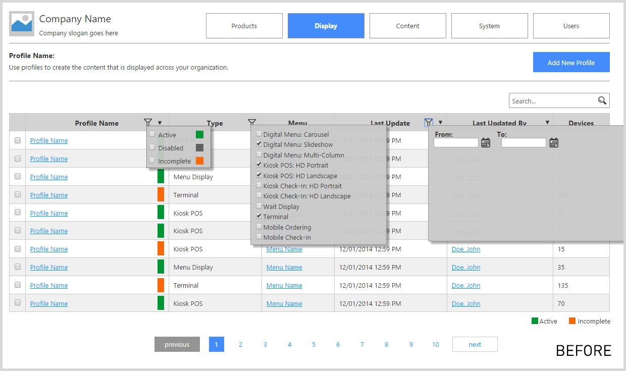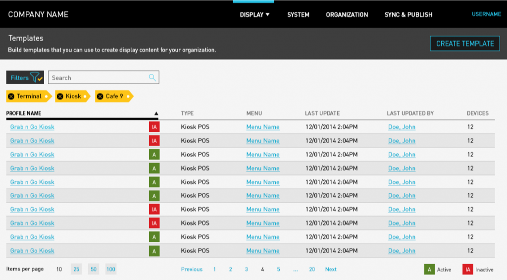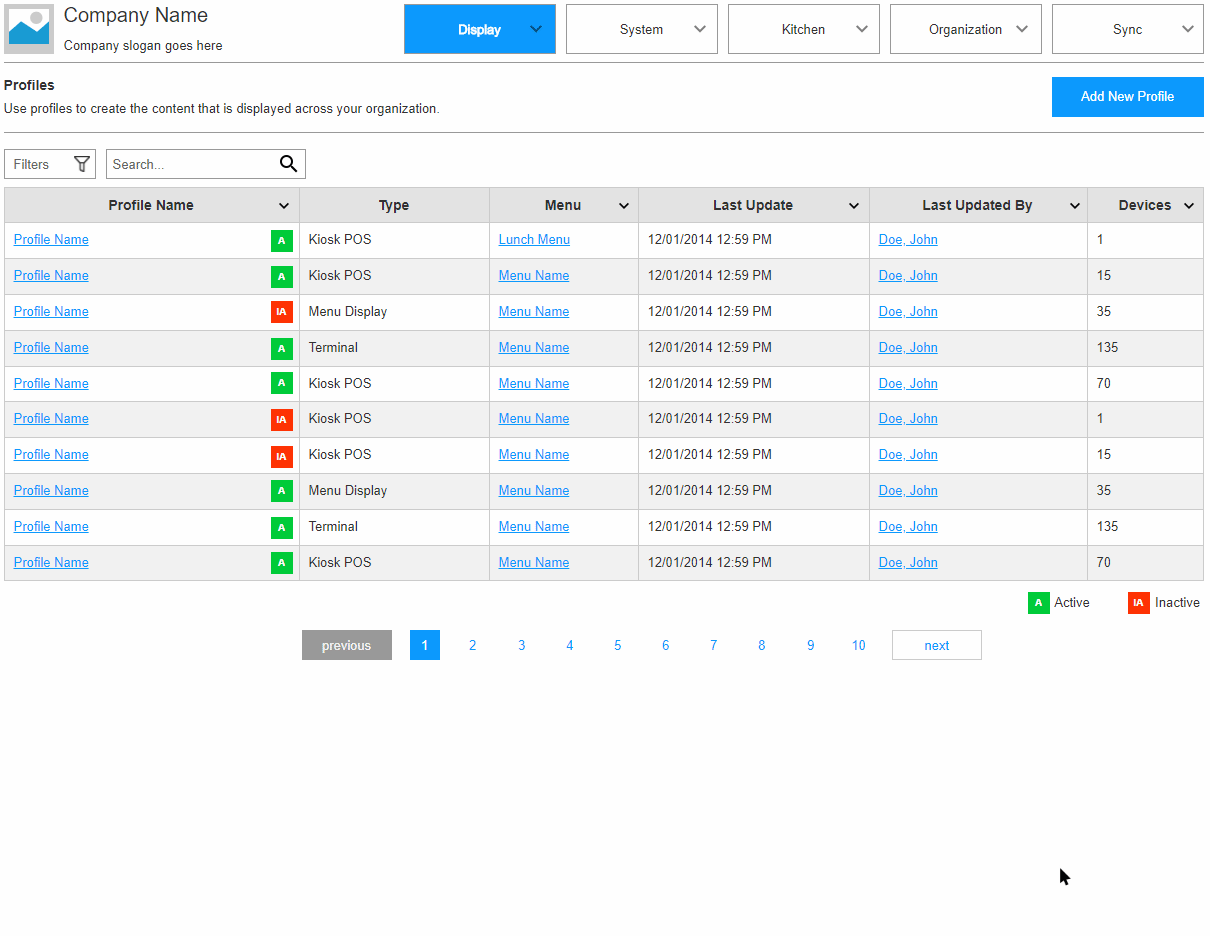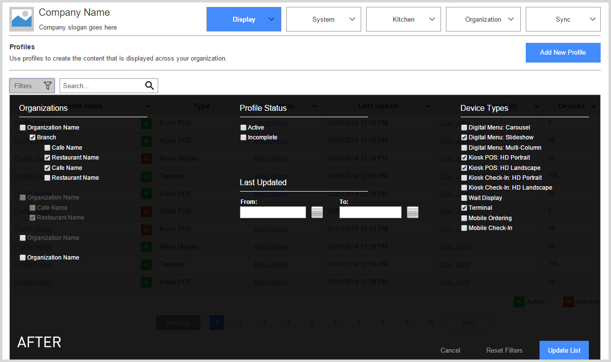 In this section after interviewing the users we understood that they want to see all of the kiosk's profiles that they can manage in a very clean interface. They need to see all profile names which in this case are POS hardware, state of the hardware either it’s active or inactive without going deeper into profile view (which we added a colored tags in the table for them to easily scan through all items), menus that specific profile is using, type of the hardware that this profile is registered to, last updated date and the last person who has updated this profile.