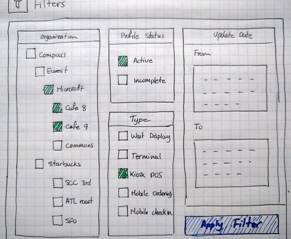 After our research we found that users had difficlutly with filtering through these kiosk prfiles. So I decided to update the fitlering to address this issue.