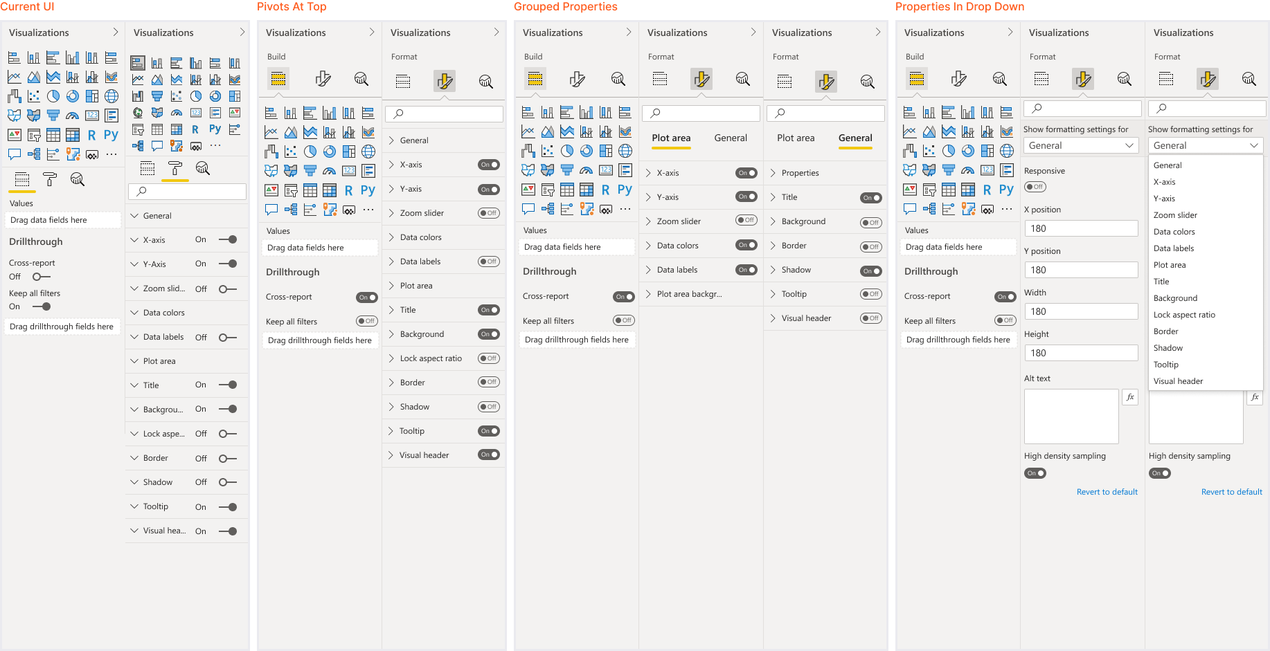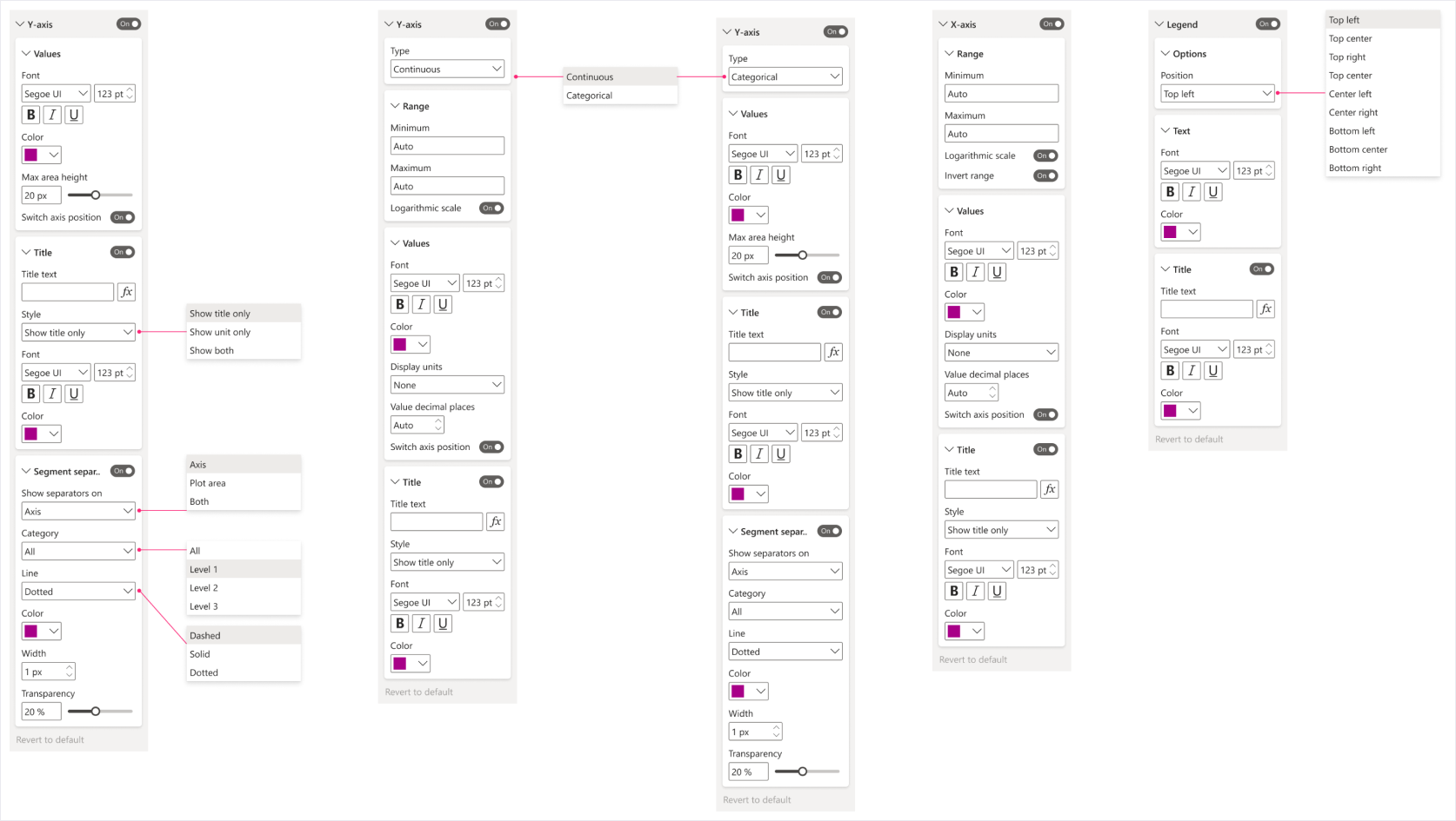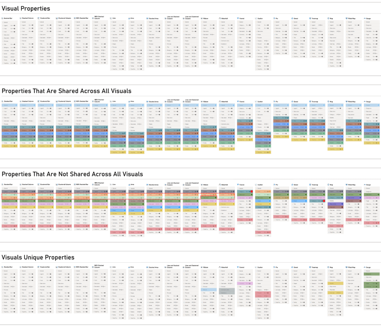 Restructured and converted all visual properties and settings based on our guidelines into new design framework with side by side comparison to old UI for engineers to be able to compare to previous version if necessary. It took between 3-4 design iterations for each visual to finallize the new structure and property order.