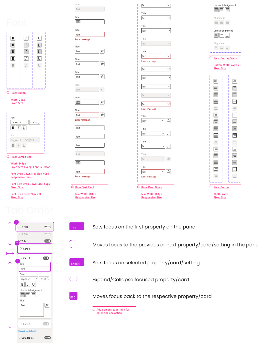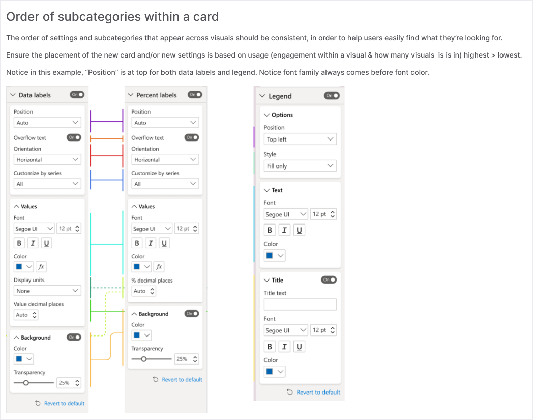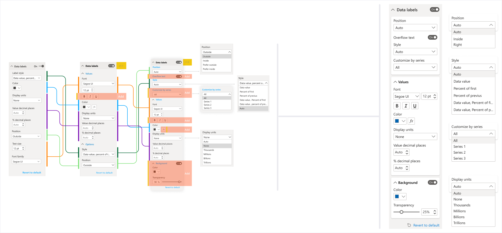 Restructured and converted all visual properties and settings based on our guidelines into new design framework with side by side comparison to old UI for engineers to be able to compare to previous version if necessary. It took between 3-4 design iterations for each visual to finallize the new structure and property order.