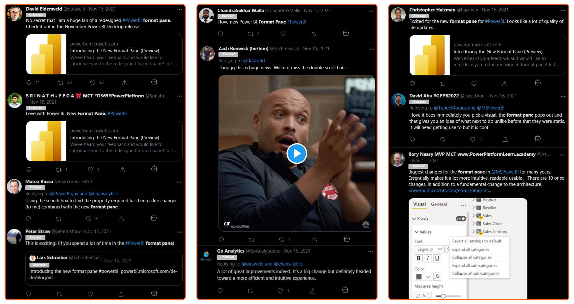 In Power BI Desktop, usually when we release a new feature there is an option to opt-in for early preview of that feature and users can turn it on or off, When we shipped the preview in March, only 2% of people turned it off (some veteran users took a while to adjust to the change). We’ve had more than 30% increase in usage since we launched this re-design publicly in June 2022. Here are some of the users reactions from Twitter: