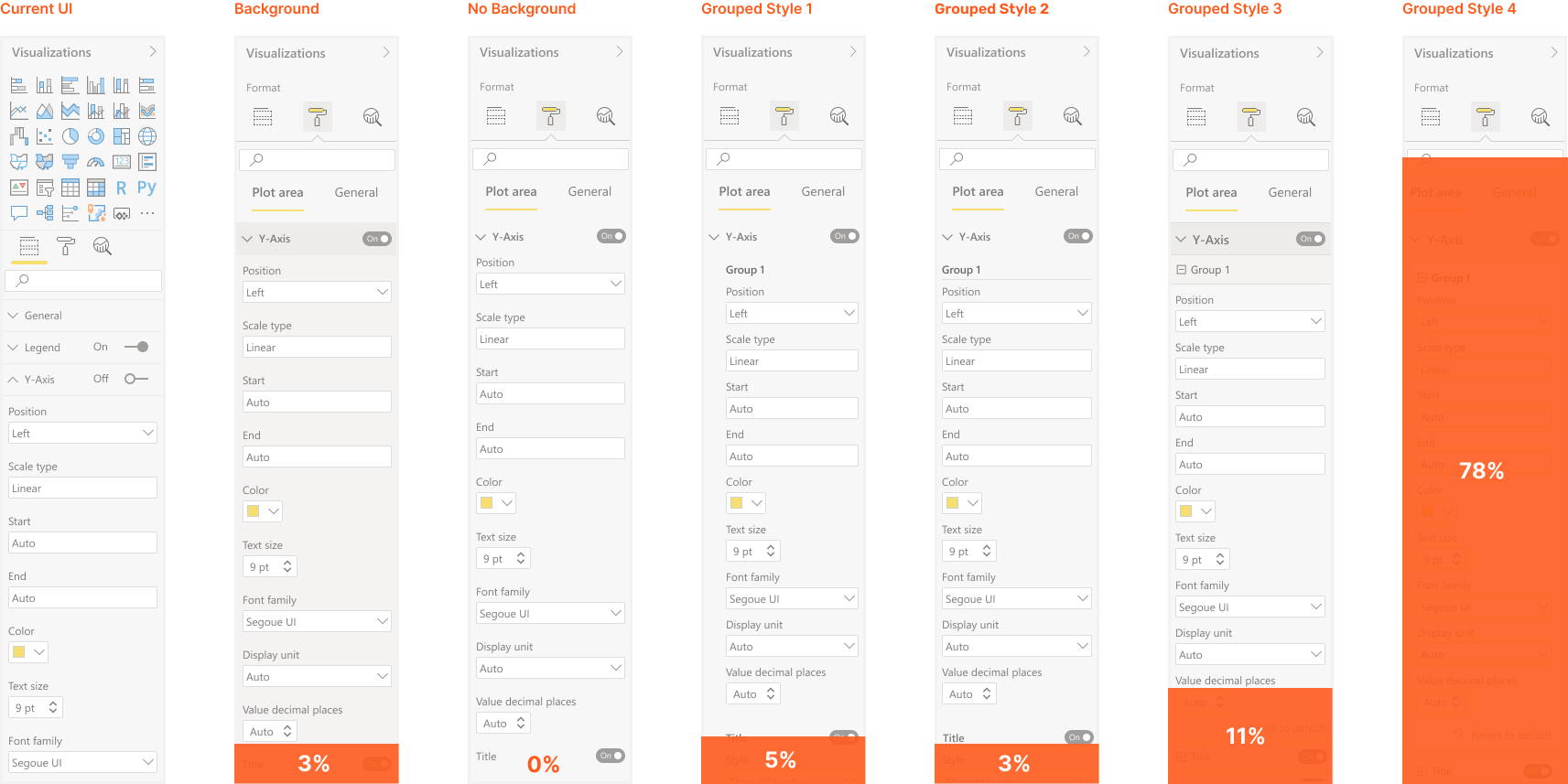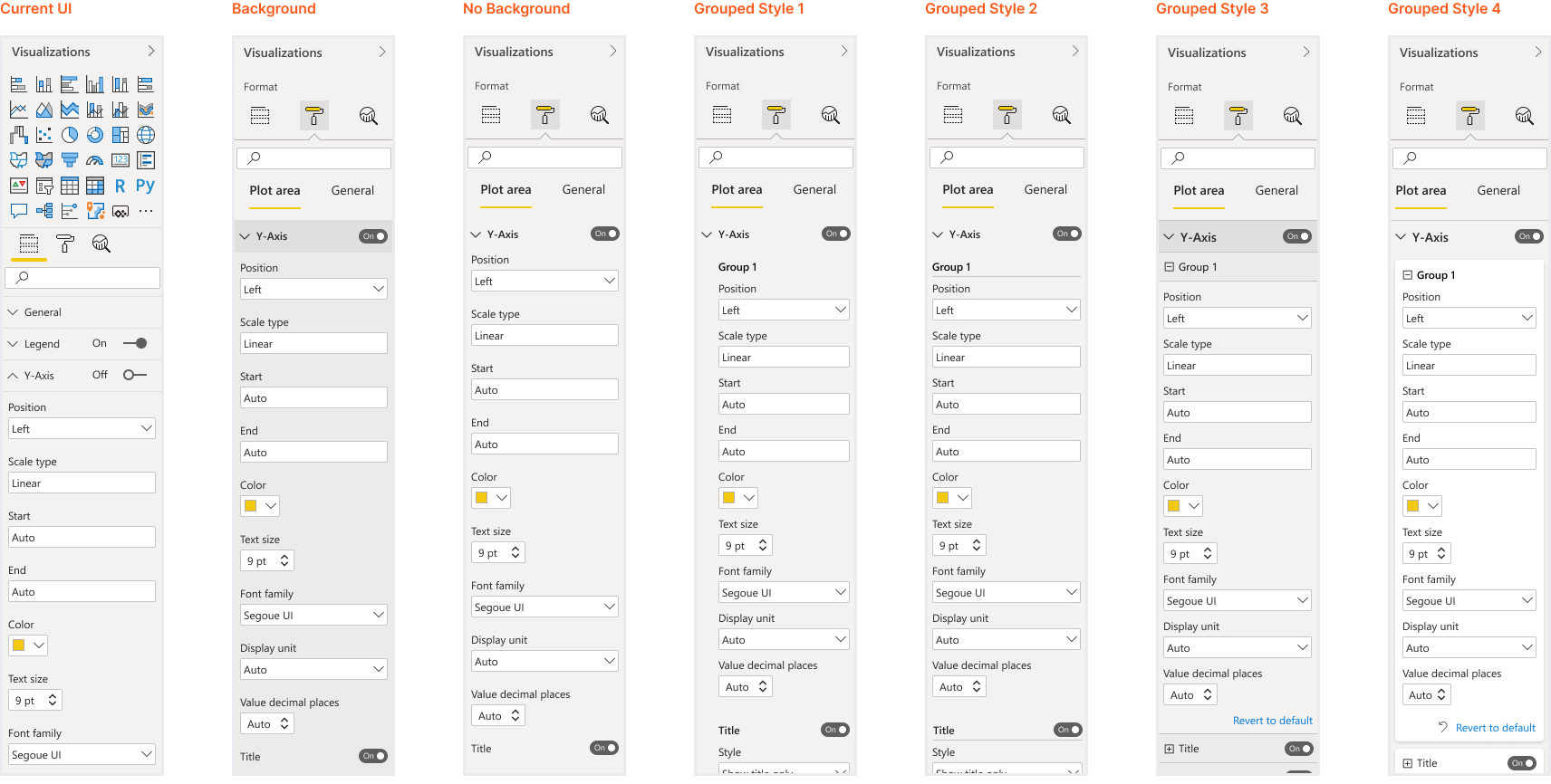 Once I became confident that the grouped version was the best solution, I began exploring various ways to group properties in our formatting pane. I iterated through multiple options, seeking to find the most efficient and intuitive grouping scheme possible: