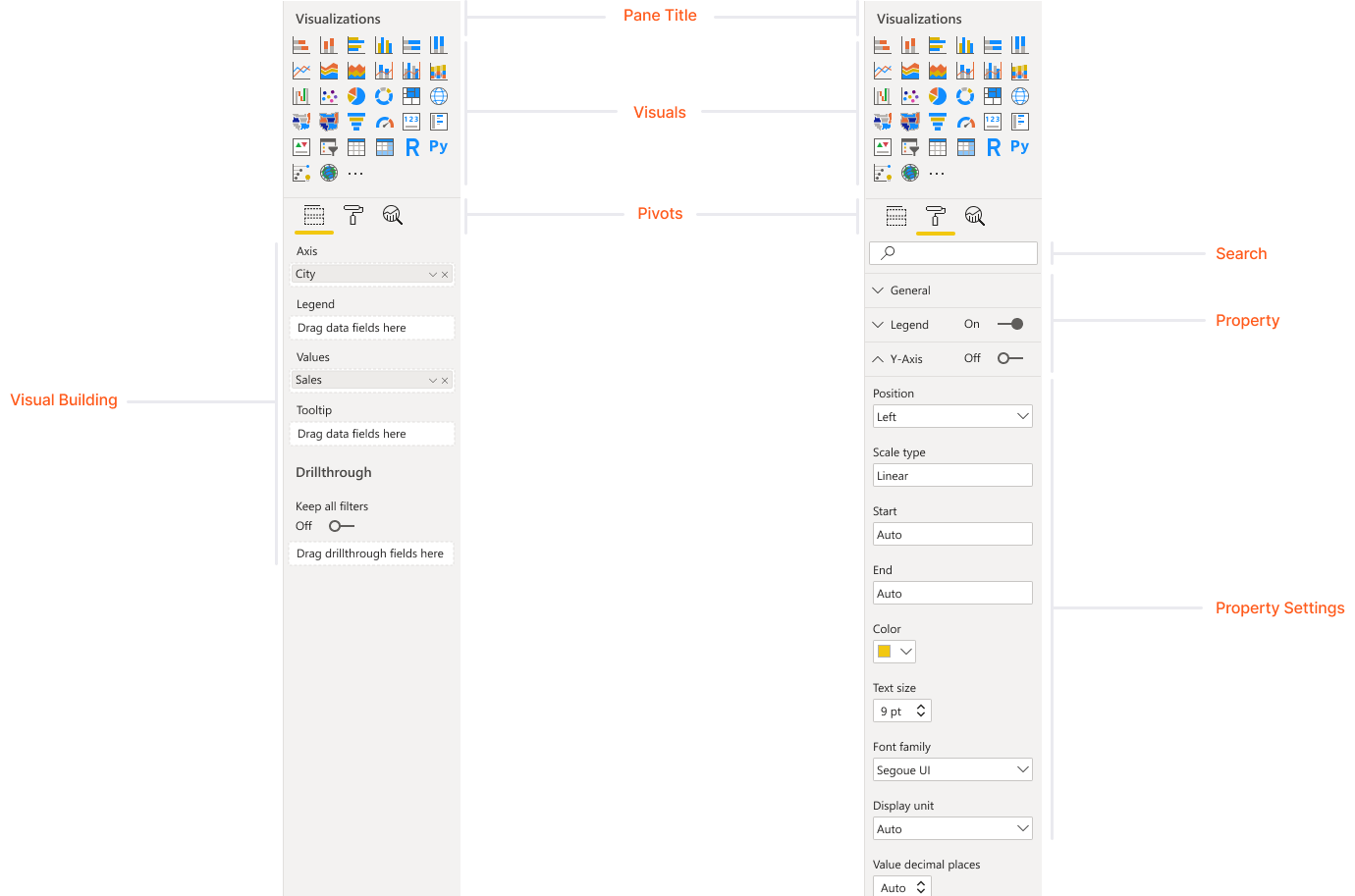 Left image is when the build part is selected and right image is when user is in formatting pivot which has search and all properties and settings of selected visual.